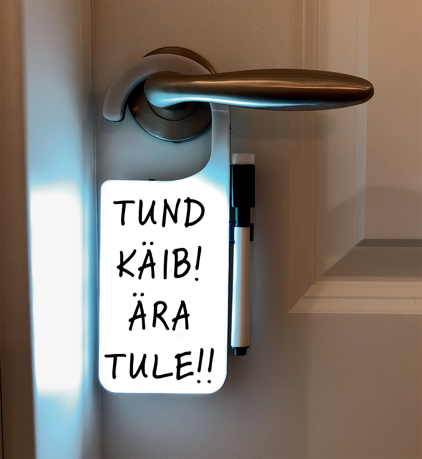 Vahva light-box stiilis uksesilt sobib hästi vajalike teadete, lühikeste sõnumite või lihtsalt loosungi stiilseks edastamiseks. Selleks on komplektis kaasas kustutajaga pliiats. Nii saad uksesildi kasvõi iga päev ümber „seadistada” – vastavalt sündmusele, tujule või aastaajale.